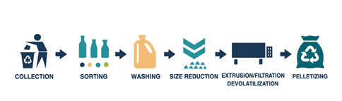 collection → sorting → washing → size reduction → extrusion/filtration/devolatilization → pelletizing → conversion