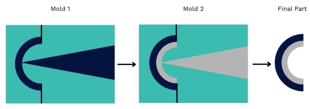 Two-shot (2K) molding: Two polymers are injected sequentially within the same machine and mold system.