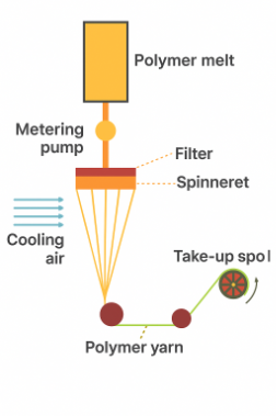 In melt spinning, polymer granules or pre-aligned blends are melted, homogenized, and pressed through a spinneret containing a single or multiple capillary openings. The emerging filaments are then quenched by controlled air or water cooling, stabilizing their geometry before they are drawn at defined take-up speeds (Fig. 1). This drawing step aligns polymer chains, increases crystallinity, and ultimately defines tensile strength and elongation.