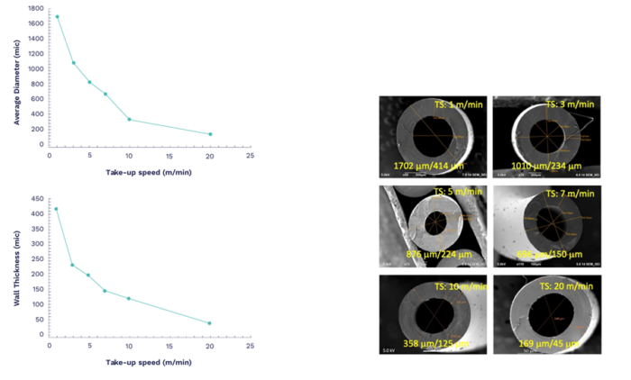 Figure 2: Effect of Take-Up Speed on Tube Dimensions and LM images showing the coaxiality & micro-tube dimensions